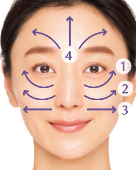 顔の内側から外側に①→④の順に薄く塗ります。この時点ではうっすらとシミが見えていて大丈夫です。