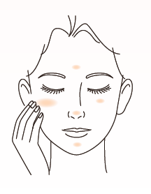 2) 両頬、額、鼻、顎の5か所において指でむらなく伸ばしながらなじませてください。