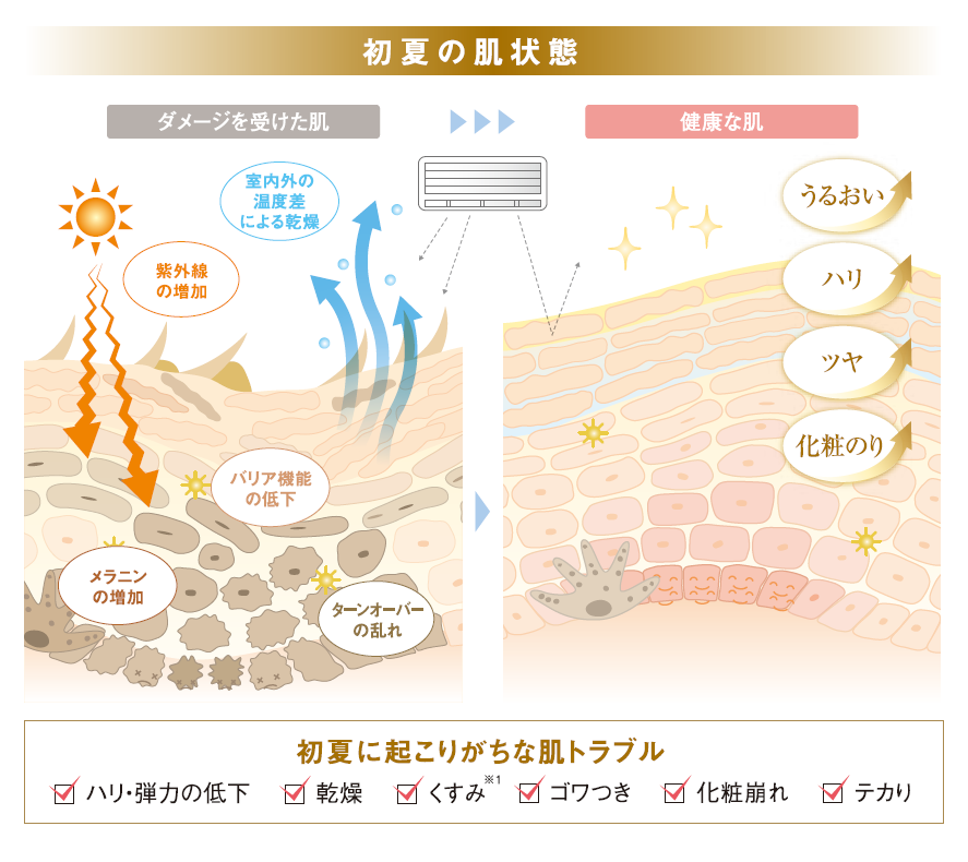 紫外線は5~6月にピークを迎え、肌は日々パワーを増す紫外線に応戦しようと、角層が厚くなります。すると、角層に隙間ができてバリア機能が低下し、肌は潤い不足に。乾燥を引き起こすことに加え、角層の隙間から紫外線が入り込むことで真皮にまでダメージを与え、ハリや弾力の減少などのエイジングを加速させます。
